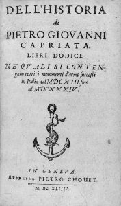 1644. (HISTORIA). CAPRIATA, PIETRO GIOVANNI: DELL´HISTORIA. Geneva: Appresso Pietro Chouet, 1644. 8º menor. 16 h. + 1205 p., 24 h. Viñetas. Enc. de época en plena piel, nervios, cortes pintados.