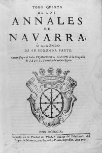 Farinan en Madrid en 1684, escudo grabado en la portada. Cabeceras, capitales y culs-de-lampe. Enc. en pergamino de época, con restauración profesional de una pérdida en la parte inferior, lomera rotulada. Es el último tomo de los Annales de Navarra escritos entre 1684 y 1715 por el padre Moret y el propio Alesón. De Moret heredó los dos primeros tomos, que revisó a conciencia, y añadió los tres siguientes. En este quinto tomo abarca veinticuatro libros del XI al XXV que comienzan con Sucesión del rey D. Francisco Febo en el Reino de Navarra y termina con Cómo el Emperador fue inculpado en el saco que se sigue de Roma… Conversión de San Ignacio de Loyola. Principios que tuvo la Compañía de Jesús referido al año 1527 en que se produjo el saqueo de Roma por las tropas de Carlos I. Dado el estado de salud de Francisco Alesón el impresor Francisco Picart trasladó su taller hasta Viana para la publicación de este último libro. Falleció el mismo año y dejó apuntes para un sexto volumen que ya nunca se publicaría.