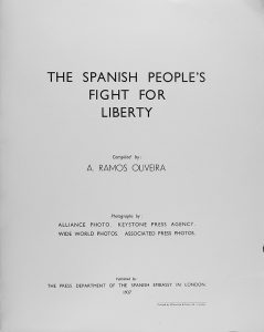 1937. (GUERRA CIVIL). OLIVEIRA, RAMOS: LA LUCHA DEL PUEBLO ESPAÑOL POR SU LIBERTAD. London: The Press Department of the Spanish Embassy in London, 1937. Folio menor. 15 p. y aprox. 100 p. de imágenes fotográficas de Alliance Photo, Keystone Press...