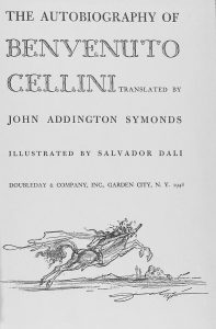 1948. (BIOGRAFIA). THE AUTOBIOGRAPHY OF BENVENUTO CELLINI. Translated by John Addington Symonds. Illustrated by SALVADOR DALÍ. Nueva York: Doubleday & Comp., 1948. 8º mayor. 442 p. Láminas a color ilustradas por Dalí. Enc. tela edit. estampada.