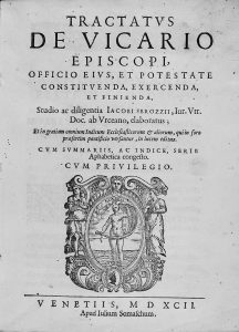 1592. (RELIGION). BROZII, IACOBI: TRACTATUS DE VICARIO EPISCOPI, OFFICIO EIUS, ET POTESTAE CONSTITUENDA, EXERCENDA, ET FINIENDA. Venetiis: apud Iulium Somaschum, 1592. 8º mayor. 30 h. + 163 fol. Grabado tipográfico en portada. Texto a dos...