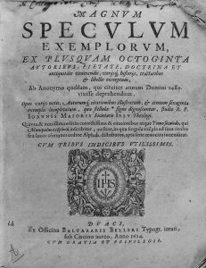 1614. (RELIGION). MAIORIS, IOANNIS: MAGNUM SPECULUM EXEMPLORUM, EX PLUSQUAM OCTOGINTA AUTORIBUS, PIETATE, DOCTRINA ET ANTIQUITATE VENERANDIS... Duaci [Douai]: Typ. Baltazaris Belleri, 1614. 8º mayor. 14 h.+ 800 p. + 36 h. Texto a dos columnas....