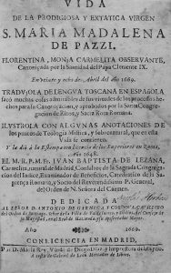 1669. (HAGIOGRAFIA). LEZANA, JUAN BAPTISTA DE: VIDA DE LA PRODIGIOSA Y EXTATICA VIRGEN S. MARIA MADALENA DE PAZZI. Madrid: Imp. Maria Rey Viuda de Diego Diaz, 1669. 8º. 8 h. + 528 p.+ 8 h. Texto a dos columnas y algo corto de márgenes. Papel algo...