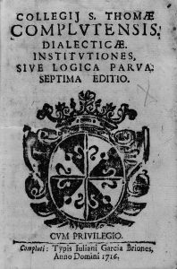 1716. (DIALECTICA). COLLEGIJ S. THOMAE COMPLUTENSIS. DIALECTICAE INSTITUTIONES SIVE LOGICA PARVA. Compluti (Alcalá de Henares): Typ. Iuliani Garcia Briones, 1716. Escudo xilográfico en la portada, 4 h. + 230 p. Enc. en pergamino. Papel algo...