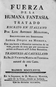 1777. (VARIA). MURATORI, LUIS ANTONIO: FUERZA DE LA HUMANA FANTASIA. TRATADO ESCRITO EN ITALIANO. Madrid: Imp. Manuel Martin, 1777. 8º menor. 6 h. + XLVI p. + 3 h. + 344 p. Enc en pergamino, lomera rotulada, desprendida. Su autor fue historiador,...