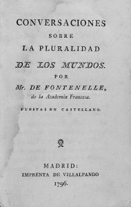 1796. (FILOSOFIA). FONTENELLE: CONVERSACIONES SOBRE LA PLURALIDAD DE LOS MUNDOS. Madrid: Imp. Villalpando, 1796. 8º menor. XVI + 207 p. Enc. en pasta española, planos rozados, tejuelo, pequeña pérdida en el lomo.