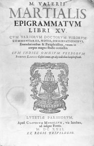 1617. (LITERATURA LATINA). MARTIALIS, M. VALERII: EPIGRAMMATVM, LIBRI XV. Cum variorvm doctorvm virorvm comentariis, notis, observationibvs... CVM INDICE OMNIVM VERVORVM, Iosephi Langii. Paris: Imp. Claudium Morellum, 1617. Folio. 8 h., 647 p. + 14...