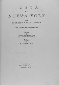 1940. (VANGUARDIAS-GENERACION 27). GARCIA LORCA, FEDERICO: POETA EN NUEVA YORK. Con cuatro dibujos originales. Poema de Antonio Machado. Prólogo de Jose Bergamín. México D.F.: Edit. Seneca, 1940. 4º menor. 187 p., 2 h., 4 láms. de dibujos a...
