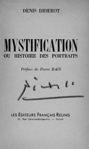 1954. (VANGUARDIAS-1ª EDICION-FIRMA PICASSO). DIDEROT, DENIS; PICASSO [ilustrador]: MYSTIFICATION OU HISTOIRE DES PORTAITS. Préface de Pierre DAIX. Paris: Les Editeurs Français Réunis, 1954. 8º. 93 p., 1h. Ex-libris a color. Frima de Picasso...