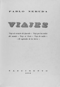1955. (VANGUARDIAS-POESIA). VIAJES. Viaje al corazón de Quevedo-Viaje por las costas del mundo-Viaje al Norte-Viaje de vuelta-El esplendor de la tierra. [Santiago de Chile]: Nascimento, 1955. Folio menor. 212 p., 2 h. Rústica editorial ilustrada.