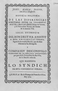 1705. (GERONA-UNIVERSIDAD). NOTICIA POLITICA DE LAS DIFERENCIAS SUSCITADAS ENTRE LA UNIVERSITAT DE LA VILA, Y BARRIS DE LA BISBAL, BISBAT DE GERONA, Y LA UNIVERSITAT FORANA DE TERME DE LA MATEIXA VILA. LEGAL EVIDENCIA DEL BON DRET HA ASSISTIT A DITA...
