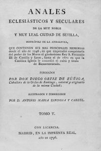 1795. (SEVILLA). ORTIZ DE ZUÑIGA, DIEGO: ANALES ECLESIASTICOS Y SECULARES DE LA MUY NOBLE Y MUY LEAL CIUDAD DE SEVILLA, METROPOLI DE LA ANDALUCIA. Madrid: Imp. Real, 1795. 5 vols. en 8º mayor. I: 7 h. + 434 p.; II: 478 p.; III: 554 p.; IV: 444 p.;...