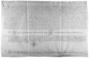 1427. (BARCELONA). TESTAMENTO DE GALCERAN DE GUALBES. Manuscrito sobre pergamino, 30 x 47 cm. Dado en Barcelona, 3 de enero de 1427.