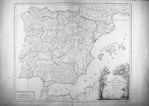 1757. (ESPAÑA). ROBERT: CARTE DES ROYAUMES D´ESPAGNE ET DE PORTUGAL DANS LAQUELLE SONT TRACEES LES ROUTES DES POSTES. Mapa grabado al cobre, límites coloreados. Plancha 50 x 58 cm, papel 53 x 75,5 cm.