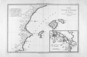 1790 ca. (MALLORCA). BONNE: ISLES MAYORQUE, MINORQUE ET YVYCE. Mapa grabado al cobre, plancha 25 x 36 cm, papel 32 x 47 cm. Coloreado.