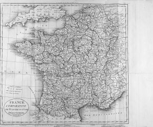 plegados. De ellos dos son planisferios más una mapa de Francia, Europa, Asia, África, América del Norte y América del Sur. Todos con los bordes coloreados. Enc. en pasta española, lomera cuajada, tejuelo. Señal de humedad.