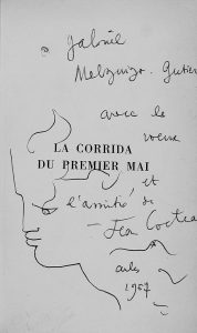 1957. (ORIGINAL COCTEAU). COCTEAU, JEAN: LA CORRIDA DU PREMIER MAI. Paris: Grasset les cahiers verts, 1957. 8º. 215 p., 5 h. Enc. en tela con rústica editorial. Original de COCTEAU plena página.