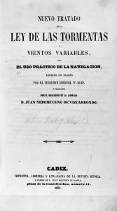 VIZCARRONDO. Cadiz: Imprenta, Librería y Litografía de la Revista Médica, a cargo de D. Juan Bautista de Gaona, 1853. 461 p. Ilustraciones en el texto y varios mapas plegados. 1ª hoja remarginada. El Tratado comienza con una explicación general de la ley por la cual se rigen las tormentas, seguido de unas reflexiones de Mr. Redfield acerca de las grandes oscilaciones del barómetro. Más adelante, en sucesivos capítulos, explica la forma de navegar y capear los temporales. A continuación, describe la forma en que se desarrollan tormentas simultáneas a opuestos lados del Ecuador, en la bahía de Bengala, en el mar de Arabia; de los tifones en el mar de China y de las tormentas tropicales en el hemisferio sur; de los temporales en la Madera (Madeira) y Mediterráneo, de los nortes en el seno Mejicano y temporales en el hemisferio septentrional. Un capítulo interesante dedicado a las observaciones realizadas en Bermuda con unas tablas para deducir el estado del tiempo por medio del barómetro.Obra fundamental para los navegantes transoceánicos desde mediados hasta finales del siglo XIX, gozando de amplia popularidad entre los marinos. Incluso, y a falta de tratados más completos, siguió utilizándose hasta principios del s. XX (c. de 1.920) en que cayó en desuso. Los grandes avances en las investigaciones meteorológicas y la utilización del telégrafo en las comunicaciones náuticas permitieron disponer de informaciones y partes del tiempo diarios de gran utilidad que permitían un seguimiento más fidedigno de la evolución de la tormenta. Palau. Ref. 256563. Muchas ilustraciones en texto y láminas plegadas. Encuadernación en plena piel.