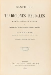 1870. (ARTE-HISTORIA-ESPAÑA). BISSO, JOSE (DIR.): CASTILLOS Y TRADICIONES FEUDALES DE LA PENINSULA IBERICA. Madrid: Achille Ronchi, autor y edit., 1870. Folio. XL + 646 p. Ilustr. en texto y 66 láms. litográficas (de 67). Antiguo cerco de humedad...
