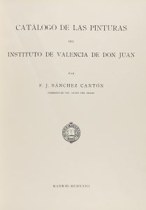 1923. (ARTE-VALENCIA). SANCHEZ CANTON, F. J.: CATALOGO DE LAS PINTURAS DEL INSTITUTO DE VALENCIA DE DON JUAN. Madrid: Edit. Reus, 1923. 4º mayor. XV + 257 p. Ilustr. en texto. Enc. en media piel, nervios, conserva cubiertas originales.
