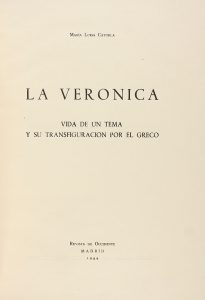 1944. (ARTE). CATURLA, MARIA LUISA: LA VERONICA. VIDA DE UN TEMA Y SU TRANSFIGURACION POR EL GRECO. Madrid: Revista Occidente, 1944. Foilio menor. 28 p., láminas. Encuadernado en plena piel con hilos dorados en los planos y escudo Saltillo en la...