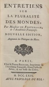 1769. (CIENCIAS). FONTENELLE: ENTRETIENS SUR LA PLURALITÉ DES MONDES. Paris: Chez la Veure Regard, 1769. 8º menor. 2 h., 4 + 8 + 192 + 304 p. y una lám. plegada. Enc. en pasta española, nervios, tejuelo, cortes pintados.