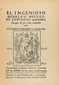 1915. (FACSIMIL). NAVARRO Y LEDESMA, FRANCISCO: EL INGENIOSO HIDALGO MIGUEL DE CERVANTES SAAVEDRA. SUCESOS DE SU VIDA CONTADOS POR. Madrid: Suc. de Hernando, 1915. 8º mayor. 616 p., 1 h. Enc. en tela, tejuelo, rotura en el plano posterior con el lomo.