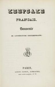 1850 ca. (GRABADOS)). KEEPSAKE FRANÇAIS. Souvenir de la literature contemporaine. Paris: Louis Janet, sa. 8º menor. 316 p. 8 láminas bellamente grabadas. Enc. en cartoné con decoraciones en dorado y estuche del mismo material. Cortes dorados....