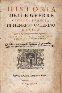 apostillas marginales. Enc. de época en plena piel rozada. Nervios. Hierros en el lomo. Plano anterior y primer cuadernillo desprendidos. Faltas en los bordes del lomo. El padre Dávila pasó una tempora en la corte de Paris. En 1599 volvió a Padua, donde estuvo al servicio de la República de Venecia. En Parma, en 1606 se enfrentó en duelo a Stigliani, al que hirió gravemente. Murió asesinado cerca de Verona, al ser enviado por la Republica como comandante de la gurarnición.
