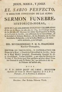 1780 ca. CADIZ, DIEGO JOSEF DE: JESUS, MARIA Y JOSEF. EL SABIO PERFECTO, Y DIRECTOR CONSUMADO DE LAS ALMAS. SERMON FUNEBRE HISTORICO-MORAL QUE EN LAS SOLEMNES EXEQUIAS... DEL REVERENDISIMO P. M. Fr. FRANCISCO XAVIER GONZALEZ. Barcelona: Eulalia...