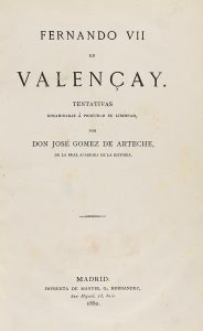 1880. GOMEZ DE ARTECHE, JOSE: FERNANDO VII EN VALENÇA Y TENTATIVAS ENCAMINADAS A PROCURAR SU LIBERTAD. Madrid: Imp. de Manuel G. Hernandez, 1880. 8º mayor. 61 p. Enc. en media piel, planos en cartoné rozados.