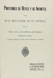 1909. (HISTORIA). MORENI Y GIL DE BORJA, LUIS: PANTEONES DE REYES Y DE INFANTES EN EL REAL MONASTERIO DE EL ESCORIAL. Publicado como suplementos en ´La Ilustración Española y America´, 1909. 4º mayor. 64 p. Láms. Enc. en tela, tejuelo.