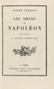 1927. (HISTORIA). TURQUAN, JOSEPH: LES SOEURS DE NAPOLEON. Paris: Ed. Jules Tallandier, 1927. 2 vols. en 8º mayor. I: VIII + 326 p.; II: 315 p. Láms. Enc. en plena piel, gofrados en los planos, corte superior dorados. Ex-libris del Marqués del...