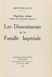 1932. (HISTORIA FRANCIA). LEVY, ARTHUR: LES DISSENTIMENTS DE LA FAMILLE IMPÉRIALE. NAPOLÉON INTIME D´APRÈS DES DOCUMENTS NOUVEAUX. Paris, Calmann-Lévy, Editeurs, 1932. 8º mayor. 217 p. Encuadernado en plena piel con ruedas en seco en los...