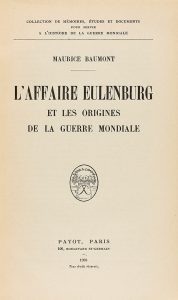 1933. (I GUERRA MUNDIAL). BAUMONT, MAURICE: L´AFFARIE EULENBURG ET LES ORIGINES DE LA GUERRE MONDIALE. Paris: Payot, 1933. 8º mayor. 281 p., 1 h. Enc. en tela, tejuelo, cortes pintados.