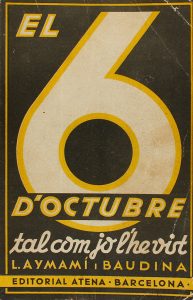 1935. (II REPUBLICA). AYMAMI I BAUDINA, L.: EL 6 D`OCTUBRE TAL COM JO L`HE VIST. Barcelona: Ed. Atena, 1935. 8º mayor. 259 p., 1 h. Rústica ilustr.
