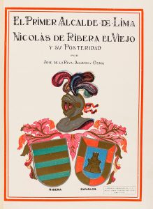 1935. (PERU). RIVA-AGÜERO Y OSMA, JOSE DE LA: EL PRIMER ALCALDE DE LIMA NICOLAS DE RIBERA EL VIEJO Y SU POSTERIDAD. Lima: Libr. e Imp. Gil, 1935. 8º mayor. 98 p., 1 h. Láms., algunas plegadas. Enc. en plena piel, nervios, gofrados en los planos,...