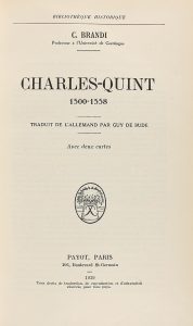 1939. BRANDI, C.: CHARLES-QUINT 1500-1558. Trad. Guy de Bude. Paris: Payot, 1939. 8º mayor. 659 p., 1 h. Enc. en media piel, nervios, cortes pintados. Ex-libris del Marqués del Saltillo.
