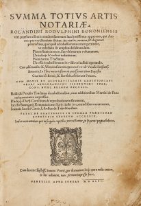 1546. (DERECHO). ROLANDINI RODULPHINI BONONIENSIS: SUMMA TOTIUS ARTIS NOTARIAE. Venetiis [Venecia]: Apud Iuntas, 1546. Folio menor. Xilografía en la portada, 4 h., 270 folios (numerados 272 pero es error de numeración). Texto a dos columnas, muy...
