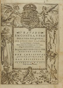 1592. (HUMANIDADES). ACOSTA AFFRICANO, CHRISTOVAL: TRATADO EN CONTRA, Y PRO DE LA VIDA SOLITARIA, CON OTROS DOS TRATADOS, UNO DE LA RELIGION, Y RELIGIOSO. OTRO CONTRA LOS HOMBRES QUE MAL VIVEN. In Venetia: presso Giacomo Cornetti, 1592. 8º. 230 p.,...