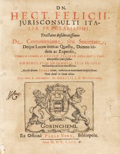 1666. FELICII, HECT.: TRACTATUS DESIDERATISSIMUS DE COMMUNIONE SEU SOCIETATE DEQUE LUCRO ITEM AC QUAESTU, DAMMO ITITDEM AC EXPENSIS. Gorinchemi: ex Officina Pauli Vink, 1666. 8º. 6 h. + 494 p., 26 h. Portada a dos tintas. Enc. en pergamino.