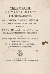 1750 ca. (CLASICOS). HENRIQUEZ DE LUNA, JOSEPHI ET JOACHIMI: TELEMACHI ULYSSIS FILII PEREGRINATIONES. Matriti: Apud Joachimum Ibarra, sa. 8º. VI + 173 p. 2 sellos estampillados en la portada. Encuadernación de época en plena piel. Ruedas en los...
