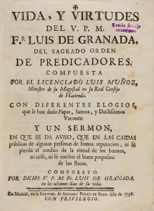 1756. (HAGIOGRAFIA). MUÑOZ, LUIS: VIDA, Y VIRTUDES DEL V. P. M. FR. LUIS DE GRANADA, DEL SAGRADO ORDEN DE PREDICADORES... CON UN SERMON... COMPUESTO POR FR. LUIS DE GRANADA EN LOS ULTIMOS DIAS DE SU VIDA. Madrid: Imp. Antonio Perez de Soto, 1756....