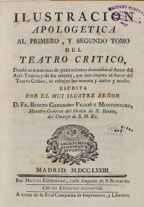 1773. (HUMANIDADES). FEIJOO Y MONTENEGRO, BENITO GERONIMO: ILUSTRACION APOLOGETICA AL PRIMERO Y SEGUNDO TOMO DEL TEATRO CRITICO. Madrid: Imp. Miguel Escribano, 1773. 8º mayor. Dos tomos en un vol.: XXXII + 248 p. y 9 h., 164 p. Dos tomos enc. en un...