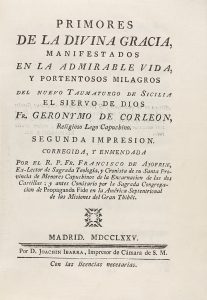 1775. (HUMANIDADES). CORLEON, GERONIMO DE: PRIMORES DE LA DIVINA GRACIA MANIFESTADOS EN LA ADMIRABLE VIDA, Y PORTENTOSOS MILAGROS. Madrid: Por D. J. Ibarra, 1775. 8º mayor. 16 p. + 326 p. Frontis grabado a cobre. Enc. en plena piel con tejuelo.