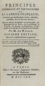 1770. (LINGÜISTICA). WAILLY, M. DE: PRINCIPES GENERAUX ET PARTICULIERS DE LA LANGUE FRANÇAISE, confirmés par des exemples choisis, instructifs, agreables, & tires des bons auteurs. Paris: chez J. Barbou, 1770. 8º menor. 600 p. Enc. de época en...
