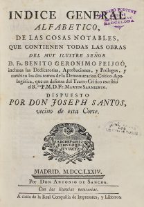 1774. (LINGÜISTICA). FEIJOO, BENITO GERONIMO: INDICE GENERAL ALFABETICO, DE LAS COSAS NOTABLES QUE CONTIENEN TODAS LAS OBRAS DEL MUY ILUSTRE SEÑOR... Madrid: Antonio Sancha, 1774. 8º mayor. 16 p. + 248 p. Enc. en pasta española, tejuelo, cortes...