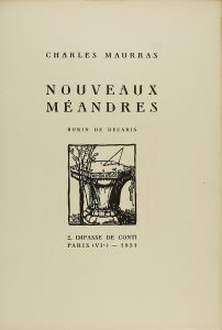 1931. (LITERATURA). MAURRAS, CHARLES: NOUVEAUX MÉANDRES. Paris: Imp. Ducros et Colas, 1931. 4º mayor. 174 p., 2 h. Un grabado y xilografía en la portada. Edición numerada en papel de hilo de 424 ejemplares. Intonso. Rústica.