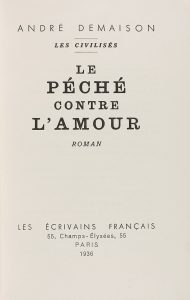 1936. (LITERATURA). DEMAISON, ANDRE: LA PECHE CONTRE L´AMOUR. ROMAN. Paris: Les escrivains français, 1936. 8º. 315 p. Enc. por Recht, en 1943 en plena piel, nervios, dorados en los planos, rasgadura en el lomo. Anotación manuscrita del Marqués...