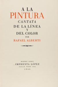 1945. (POESIA-ILUSTRACIONES). ALBERTI, RAFAEL: A LA PINTURA CANTATA DE LA LINEA Y DEL COLOR. Cantata de la línea y del color. Buenos Aires: Imprenta López, 1945. 4º mayor. 33 p., 1 h. Numerosas láminas color y b/n con reproducciones de obras...